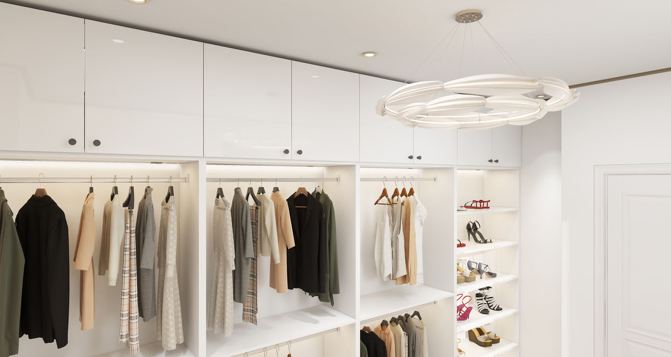 This luxurious walk-in closet showcases a modern, sleek design with high-gloss white cabinetry and well-lit open shelving. The space offers ample storage, with a mix of hanging rails, drawers, and display shelves for showcasing clothing and accessories. A marble-topped bench adds functionality, while a full-length mirror with LED lighting enhances the elegant atmosphere. Recessed lighting and a stunning, contemporary chandelier complete the space, creating an inviting, organized sanctuary. This closet is designed for those who desire both aesthetics and utility, offering a perfect blend of style and functionality for an elevated wardrobe experience.