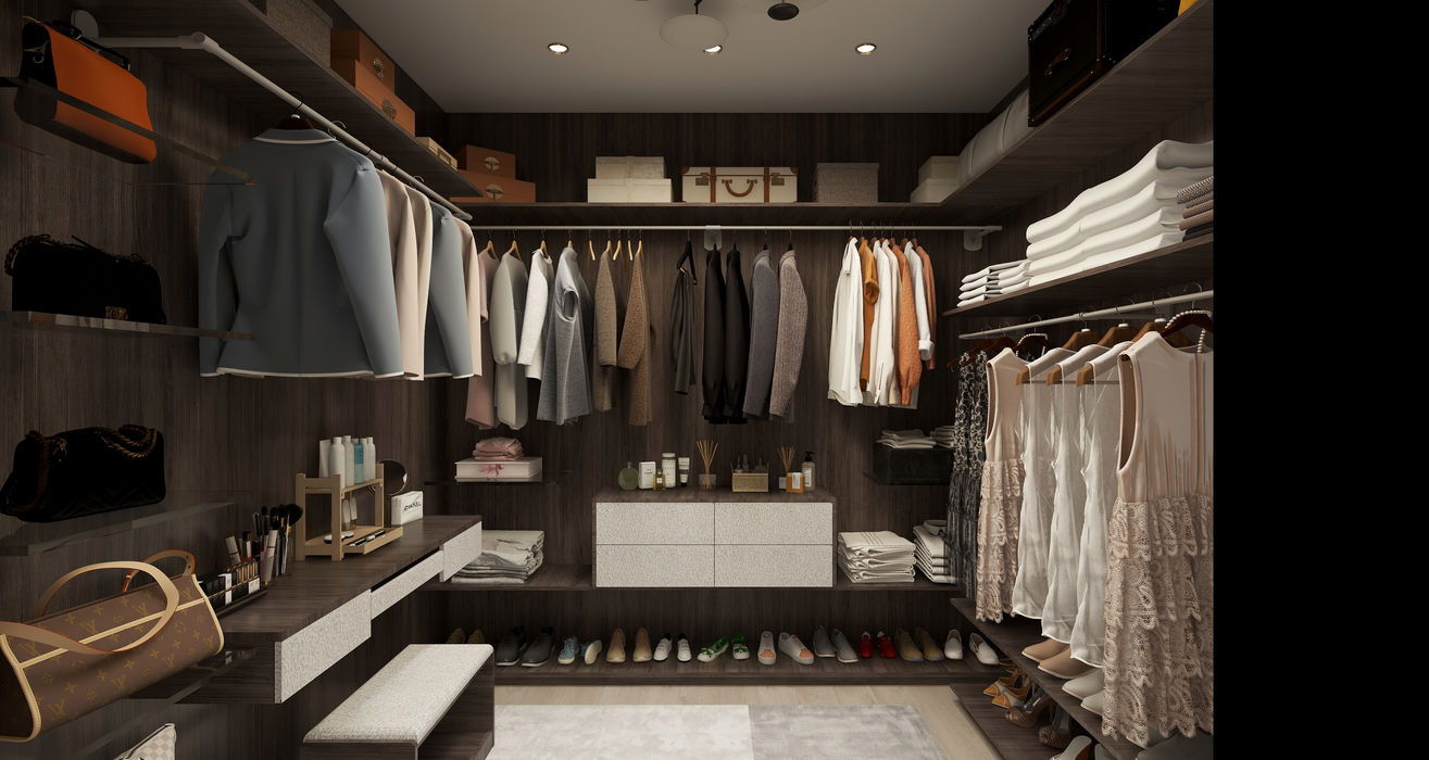 This walk-in closet strikes a perfect balance between modern sophistication and cozy elegance. The dark wood cabinetry creates a warm, inviting atmosphere, while the built-in hanging space and shelving provide ample storage for clothes, shoes, and accessories. The soft-textured drawers add a stylish contrast, and the open shelves above offer space for displaying luxury items or storage boxes. A well-organized shoe display below enhances functionality, and the thoughtful arrangement of personal items like perfumes and skincare products gives the closet a personalized touch. This design is ideal for those seeking a refined, yet intimate wardrobe space.