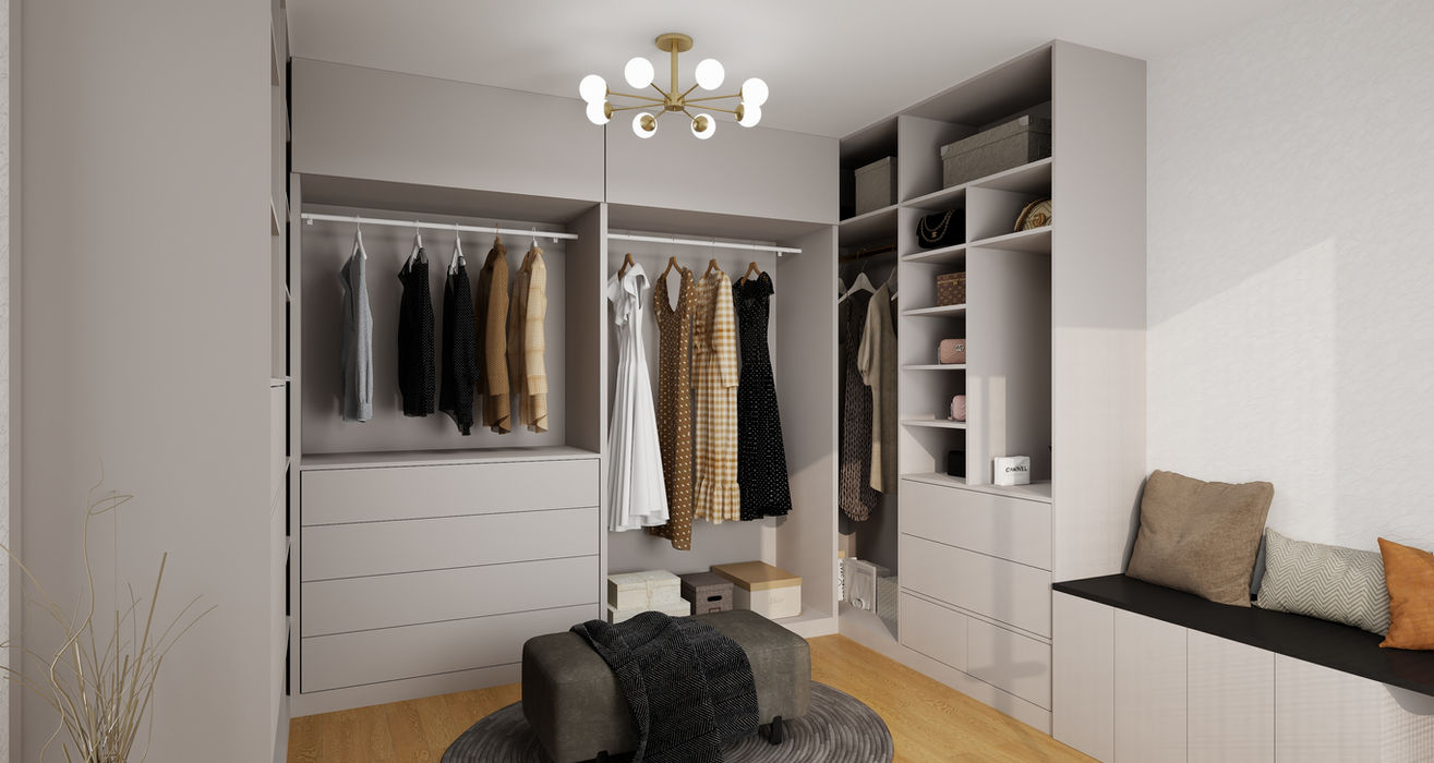 This walk-in closet exudes sophistication with its minimalist design and efficient layout. The combination of open shelving, hanging racks, and built-in drawers ensures optimal organization for clothing and accessories. A chic brass chandelier adds a touch of glamour, while the carefully curated display shelves highlight personal items, books, and luxury fragrances. The neutral palette of white cabinetry, soft lighting, and gold accents creates a serene, upscale environment. Perfect for fashion enthusiasts, this closet offers a refined space for both storage and style, elevating the everyday wardrobe experience with its elegant, practical design.