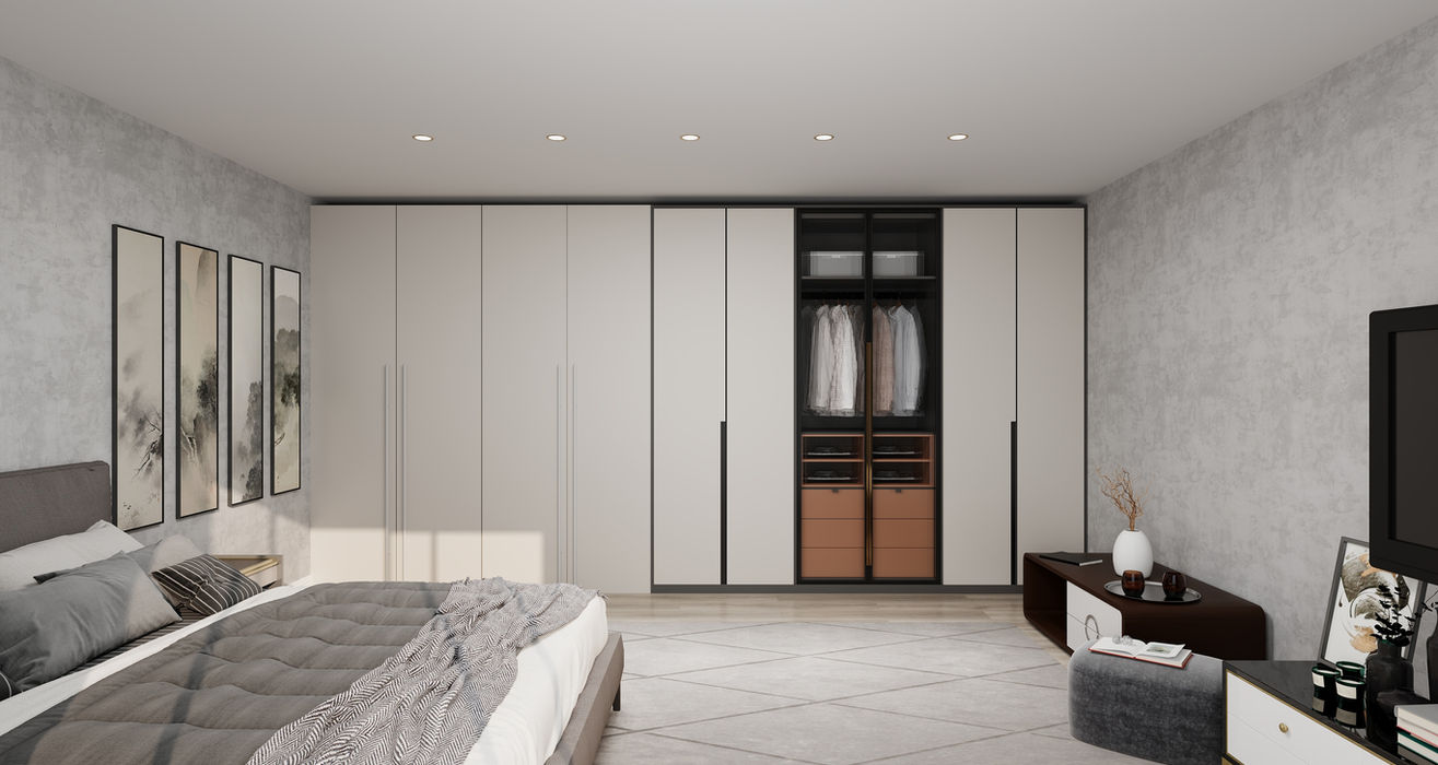 This modern wardrobe offers a sleek, minimalist design perfect for any contemporary bedroom. The closet features an elegant combination of soft beige panels and black framing, creating a bold contrast. With spacious storage options, it includes closed compartments for a clutter-free look and open sections for displaying clothing and accessories. The rich, wooden drawers at the center add warmth and functionality, while the built-in hanging space and shelves maximize organization. Recessed lighting enhances the overall aesthetic, making it a luxurious yet practical addition to your home decor. Ideal for those seeking a stylish and efficient storage solution.